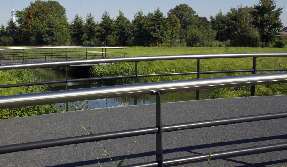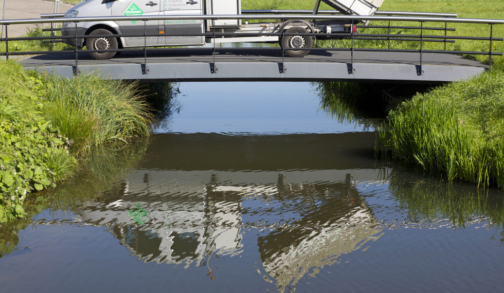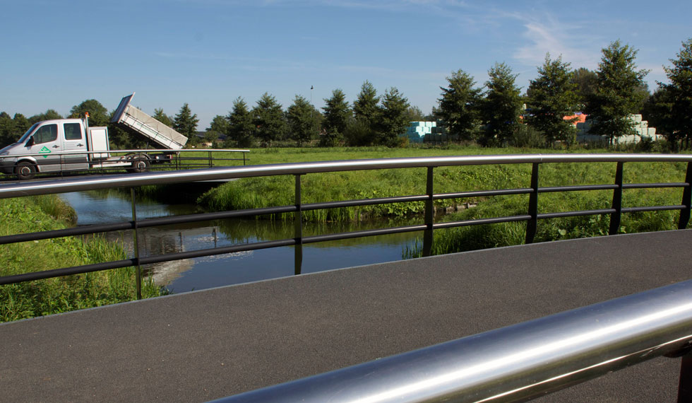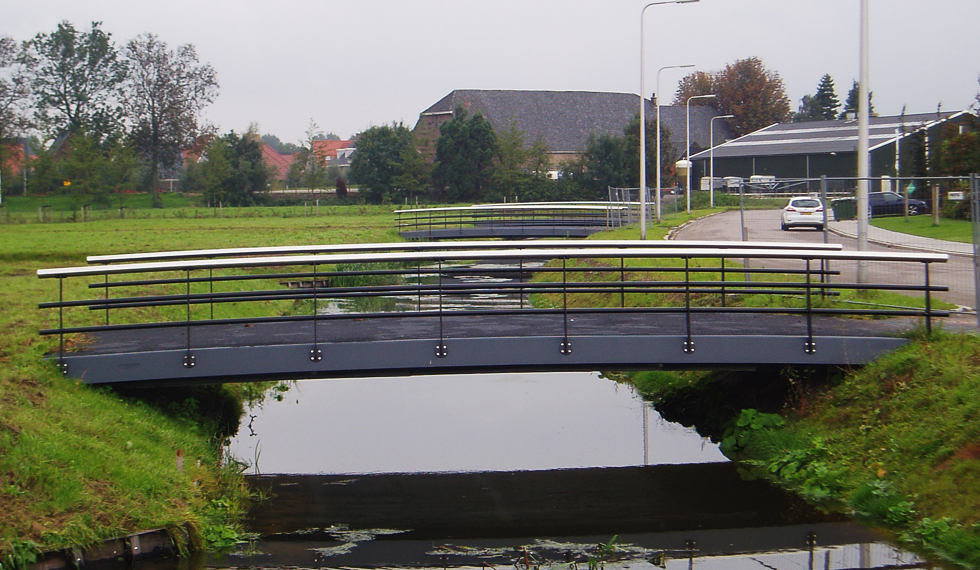 Een project van 7 identieke verkeersbruggen die elk de openbare weg verbinden met een bedrijf omringd door water. Dit project is gerealiseerd in nauwe samenwerking met Haasnoot Bruggen, die ook de balustrades leverde.