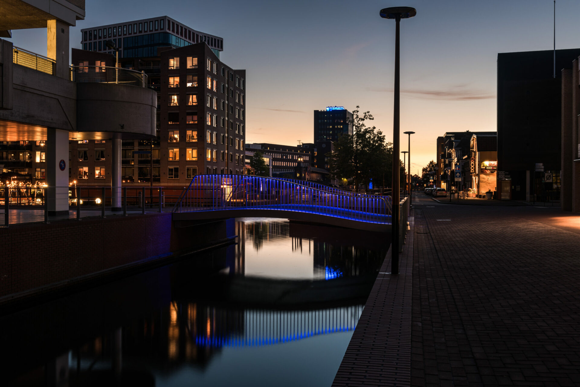De brug is voorzien van led-verlichting die gelijktijdig brandt met de verlichting van de natuurstenen traptreden in de havenkom en de bedriegertjes. De brug is gebouwd door Van Heteren, onderaannemer van Roelofs. De leuningen zijn gemaakt door PWS uit Almelo.