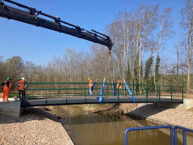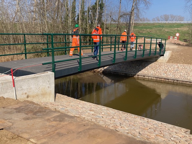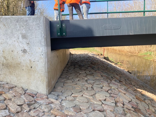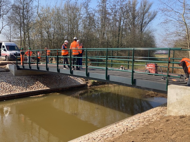 Beautiful bridge installed over the Dortherbeek River. With the color scheme and finish of the deck and the design of the railing, almost any look can be achieved. From ultra sleek and modern, to classic and rural.