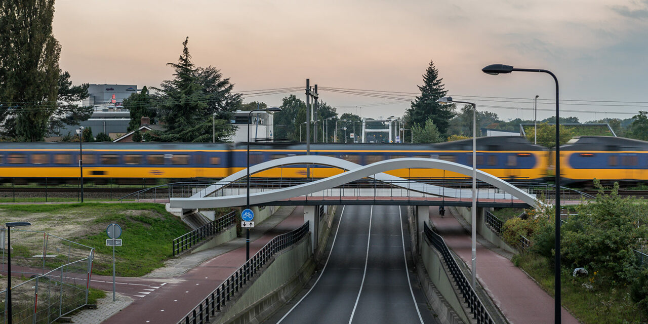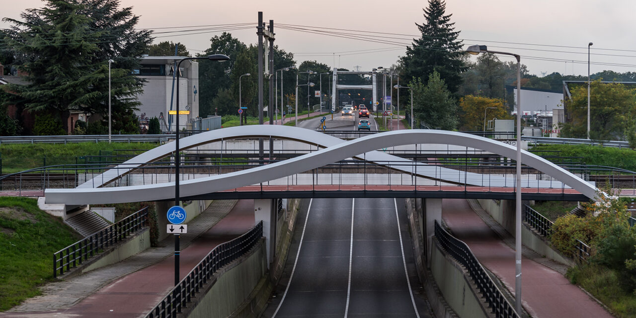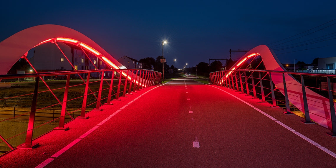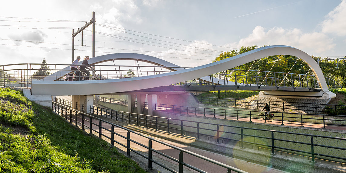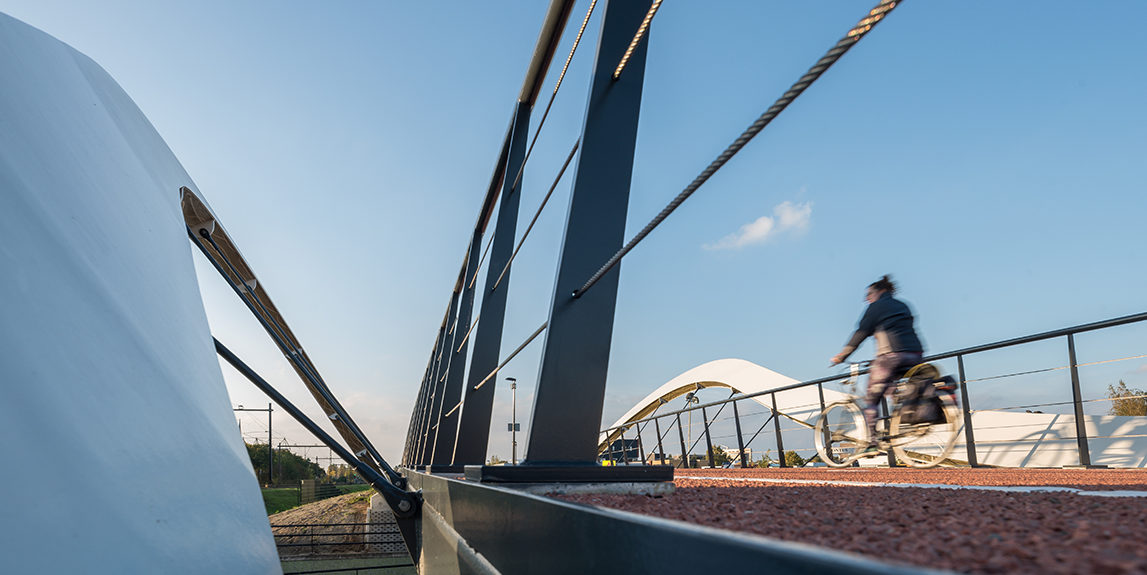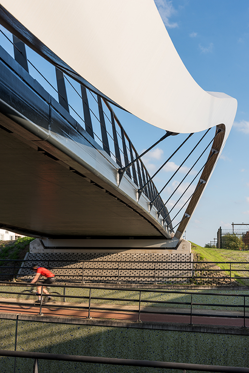 Zo ontstaat een lichte, onderhoudsarme boog-hangbrug, waarin de combinatie van materiaaleigenschappen maximaal wordt benut. Dit maakt het mogelijk om te volstaan met een dekdikte van slechts 30 cm.