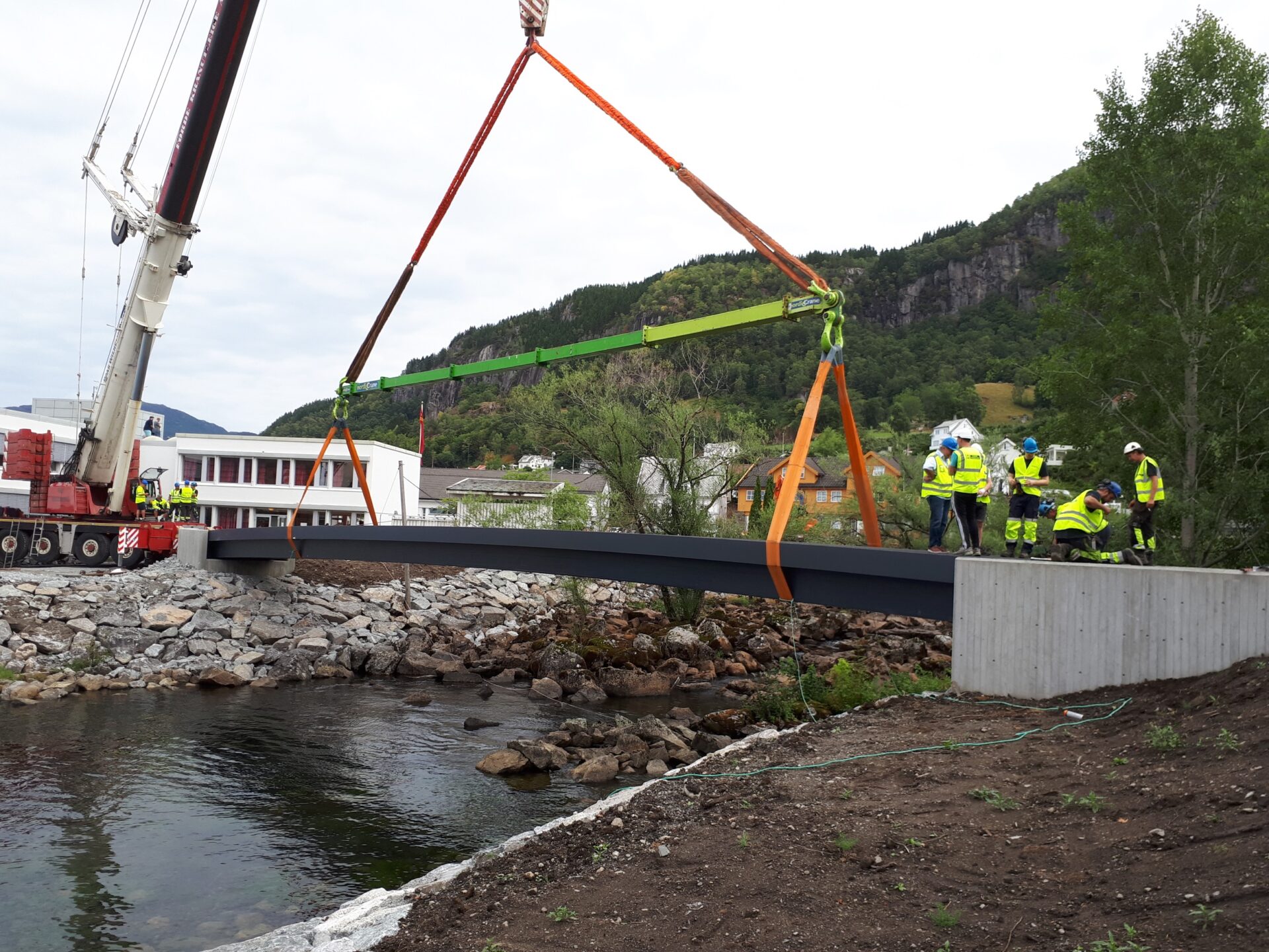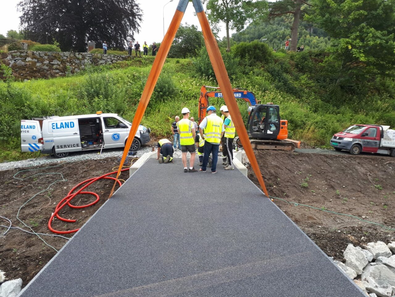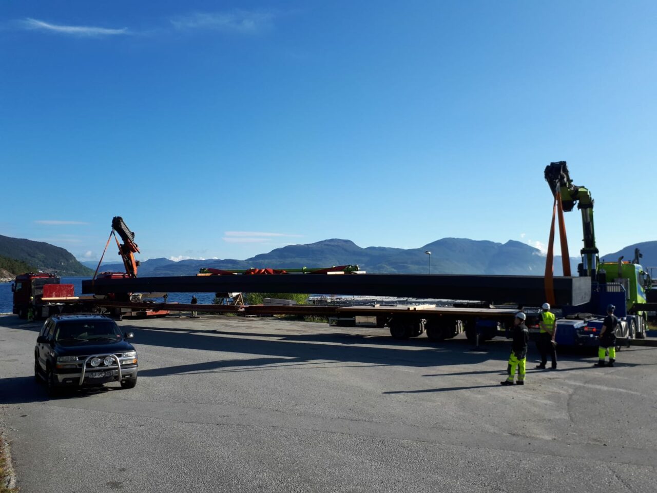 Voor onze agent in Noorwegen – Module Solutions & Systems – produceerde FiberCore Europe deze 32 meter lange prefab composietbrug. De brug werd verscheept naar Noorwegen, waar het – geladen op een vrachtwagen – de laatste 7 kilometer aflegde over bochtige Noorse wegen (dit zorgde voor wat spannende momenten!). Op de eindbestemming in Hjelmeland werd de brug aan één kant vastgeklemd geplaatst voor extra stijfheid en slankheid.