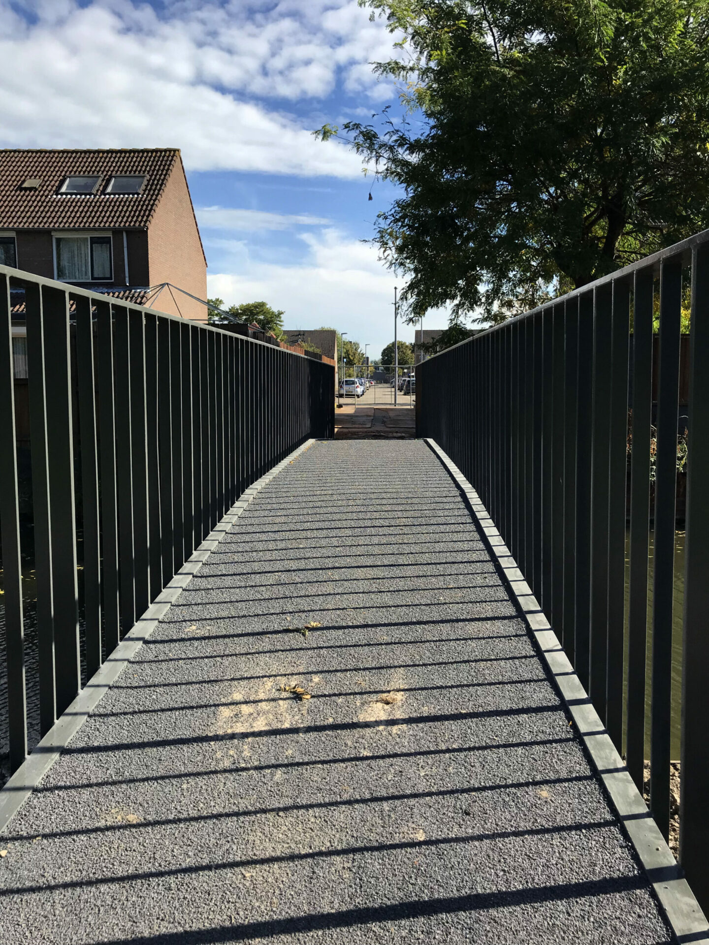 De eigenschappen van composiet als bouwmateriaal in bruggen wordt hier goed bent door de kenmerkende ‘knikken’ in het ontwerp van de bruggen; een verwijzing naar karakteristieke oud Hollandse polderbruggen.