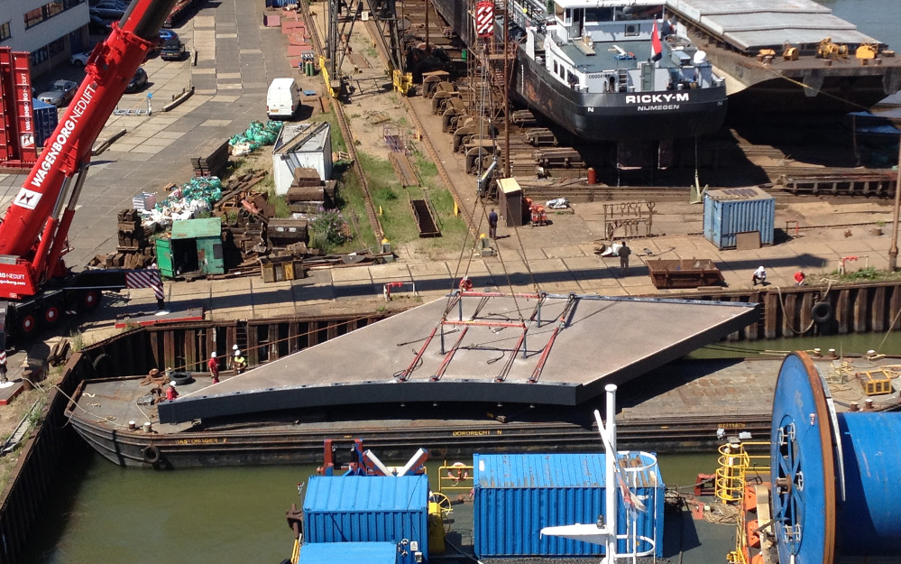 Het was een bijzonder schouwspel in 2014; het ernorme brugdek voor de Kruisvaartbrug werd in Utrecht over de weg naar haar eindebestemming vervoerd. Eerder was het composiet dek, bedoeld voor een nieuwe busroute nabij het station, over het water van Rotterdam naar Utrecht vervoerd.