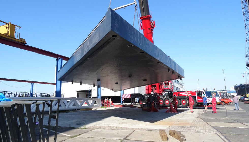 Een composiet dek was de beste keuze voor deze locatie; het dek moet af en toe verwijderd kunnen worden om de doorvaart naar een nabij gelegen werf mogelijk te maken.